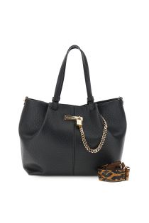 Sac cabas effet cuir grainé avec chaîne logotée et cadenas. Bandoulière amovible en ruban animalier pour un look audacieux et ultra-féminin.