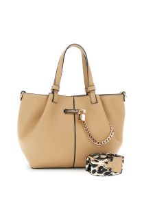 Un sac cabas épais en similicuir grainé, orné d'une chaîne à logo et d'un cadenas en métal. Une bandoulière en ruban à motif animalier lui confère un style audacieux, pratique et ultra-tendance.