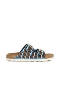 Sandales chaussons plats à double boucle avec motif strass et sequins. doublure en cuir. cale de 2.4 cm de hauteur. un croisement entre le style bohème et ethnique pour un été plein de style