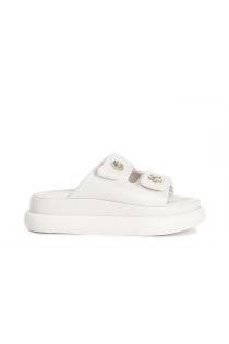 babouche en cuir avec deux fermetures velcro et boutons bone