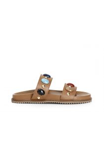 Babouche en cuir avec double bande et pierres décorées. la doublure et la semelle intérieure sont en cuir. fussbett confortable de 2.5 cm de haut.