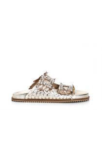 Babouche en cuir tressé avec double boucle bijou. la doublure et la semelle intérieure sont en cuir. fussbett confortable de 2.5 cm de haut.
