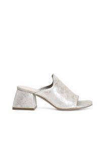 Babouche en daim lamé. la semelle intérieure est en cuir. chaussure qui peut être portée toute la journée grâce au talon large de 6.3 cm de haut et à la base de maintien confortable.