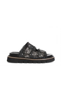Babouche en tissu denim avec double boucle. la tige est ornée de clous et de strass. la cale mesure 2.9 cm de haut. une chaussure qui allie style praticité et polyvalence. des chaussures parfaites pour l'été à porter avec des jupes longues et larges.