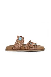Babouche en cuir tressé avec double boucle. accessoire bijou. fermeture velcro. la doublure et la semelle intérieure sont en cuir. fussbett confortable de 2.5 cm de haut.