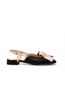 Ballerine bimatière ouverte derrière avec frange bicolore. Le jeu des couleurs différentes décore également la bride. Semelle rembourrée insérée dans le talon bally bandé également en cuir.