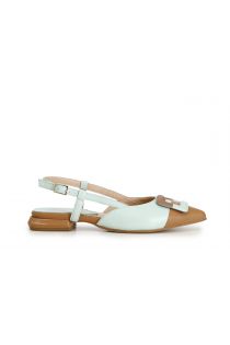 Ballerines en cuir ouvertes derrière avec accessoire carré décorant la pointe. talon gainé en cuir.