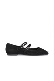 Ballerines en daim avec double lacets. la semelle intérieure en cuir. chaussure de forme légèrement carrée. le talon mesure 1.5 cm.