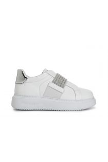 Sneakers en cuir avec inserts enrichis de sequins et lamées. micro-brides élastiques en strass enrichissent et embellissent la chaussure et facilitent le maintien. la semelle est en forme de cassette et la semelle intérieure est en cuir.