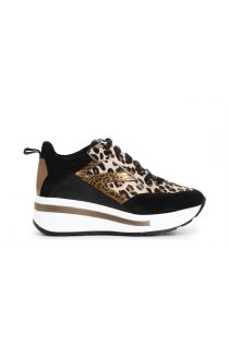 Sneakers en cuir à lacets avec empeigne ornée d'un patchwork d'imprimés animaliers et de détails lamés. semelle surélevée bicolore avec logo embossé.