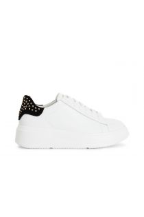 Baskets pour femmes en cuir recouvert avec empiècements lamés sur le talon. la semelle mesure 4 cm de haut.