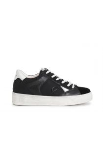 Baskets pour femmes en cuir et daim avec inserts vernis et effet métallisé. logo latéral en relief avec monophragme cafènoir. chaussure de forme arrondie. fermeture en dentelle. assise plantaire interne. semelle cassette de 30 mm.