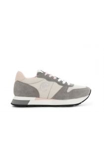 Baskets pour femmes bicolores en daim et tissu. logo latéral en relief avec monogramme cafènoir. fermeture avec lacets colorés. assise plantaire interne. semelle en caoutchouc multicolore de 30 mm.