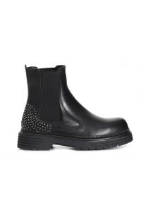 Bottine pour femme avec élastiques latéraux pour faciliter l'ajustement. chaussure ornée de clous chromés sur le talon.