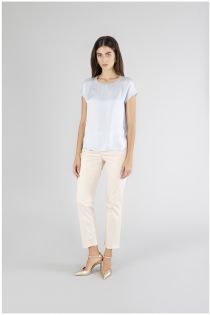 Blouse à manches courtes et épaules tombantes en satin de viscose. détail avec côtes et lurex pour finir le décolleté. la blouse est parfaite comme sous-veste à combiner avec des tailleurs et des tailleurs.