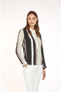 Blouse réalisée en crêpe marocain de viscose imprimé, caractérisée par une encolure large dont le bord est de couleur contrastante. Manches longues légèrement froncées au bout.