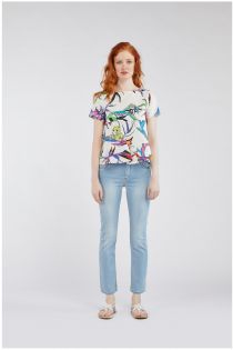 Blouse à manches mi-longues avec volants en tissu imprimé et encolure arrondie. Disponible dans trois imprimés fantaisie exclusifs.