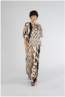 Blouse à manches courtes évasées et ceinture autour du cou en satin de viscose avec imprimé foulard exclusif disponible en deux variantes de couleurs. parfait à combiner avec un pantalon coordonné.
