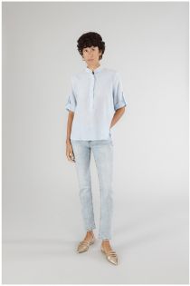 Chemise coupe confort à encolure coréenne confectionnée dans une élégante mousseline de soie mélangée. manches retroussées jusqu'aux coudes. un incontournable du dressing à porter en journée avec une jupe ou un jean.