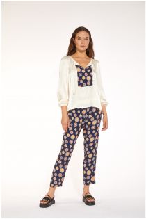 Blouse souple avec plastron imprimé, encolure ronde avec fente centrale et manches longues légèrement froncées en bas.
