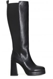 Botte haute stretch en simili cuir avec élastique à l'arrière. plateforme de 22 mm et talon haut de 100 mm. forme arrondie. la semelle intérieure est en cuir. tout cela donne un équilibre entre hauteur beauté et confort.