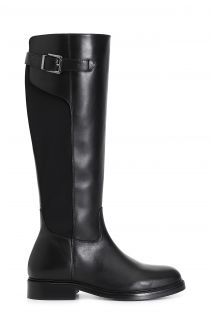 Bottes pour femme en cuir et lycra stretch avec boucle décorative. le talon mesure 30 mm de haut et la semelle intérieure est en cuir.