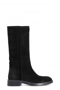 Botte modèle knight en daim de forme arrondie. talon haut de 33 mm. la semelle intérieure est en cuir.
