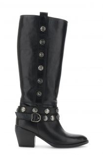 Bottine en cuir ornée de boutons décoratifs et d'une bride de cheville amovible pour une touche audacieuse. Doublure et semelle intérieure en cuir. Talon évasé de 7 cm de large. Un style rock raffiné.