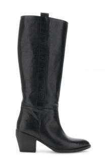 Bottes en cuir noir au design à la fois simple et audacieux, rehaussées de détails ton sur ton. Doublure et semelle intérieure en cuir. Talon bloc de 7 cm pour une élégance décontractée et contemporaine.