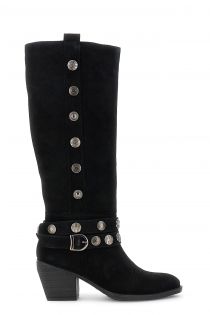 Bottines en daim ornées de boutons métalliques décoratifs et d'une bride de cheville amovible. Doublure et semelle intérieure en cuir. Talon bloc de 7 cm pour un style audacieux et affirmé.