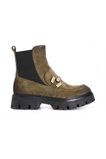 Bottines pour femme en daim ornée d'une attache et d'un élastique sur le côté. la semelle intérieure est en cuir. modèle polyvalent et dynamique idéal pour compléter de nombreuses tenues.