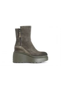 Bottines en daim pour femme avec fermetures éclair en métal. semelle intérieure en cuir et semelle compensée personnalisée avec logo en relief à l’arrière.