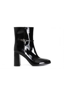 Bottine pour femme en cuir verni avec bride et accessoire personnalisé. talon carré de 88 mm. la semelle intérieure est en cuir. chaussure très polyvalente et chic pour interpréter avec style les looks de bureau et de loisirs.