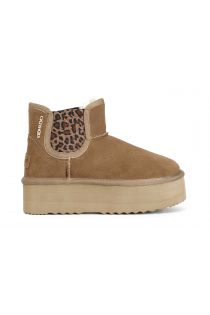Bottines en daim avec bandes élastiques à imprimé tacheté. doublure en fourrure synthétique et nouvelle semelle compensée de 35 mm.
