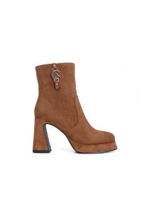 Bottines pour femme en microfibre avec breloque cafènoir. chaussures dans le plus pur style des années soixante-dix. le talon haut de 95 mm associé à la plateforme de 18 mm offre un équilibre entre hauteur beauté et confort.