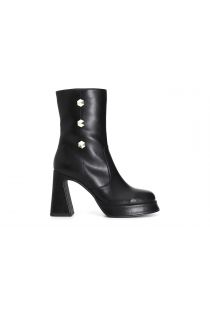 Bottines pour femme en simili-cuir avec trois cabochons hexagonaux. chaussures dans le plus pur style des années soixante-dix. le talon haut de 95 mm associé à la plateforme de 18 mm offre un équilibre entre hauteur beauté et confort.