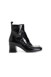 Bottines pour femme en cuir verni avec surpiqûres ornementales sur la tige. le style très chic vous permet de les porter avec n'importe quelle tenue pour tous les jours ou en soirée. la pointe et le talon sont carrés.