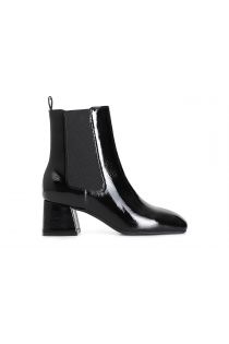 Bottine pour femme effet verni. semelle intérieure en cuir avec élastique latéral pour faciliter l'ajustement. talon de 60 mm d'épaisseur. la semelle intérieure est en cuir.