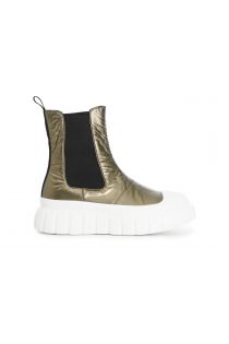 Bottines style sportif avec des bandes élastiques sur le côté de la chaussure pour faciliter le maintien. tige en tissu lamé avec rembourrage matelassé. semelle surélevée présente un motif strié distinctif.