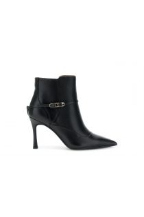 Bottine en cuir pour femme avec boucle personnalisée et zip à l'intérieur. talon fin de 87 mm de hauteur. forme mince. la semelle intérieure est en cuir. chaussure au style élégant et féminin.