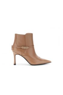 Bottine en cuir pour femme avec boucle personnalisée et zip à l'intérieur. talon fin de 87 mm de hauteur. forme mince. la semelle intérieure est en cuir. chaussure au style élégant et féminin.