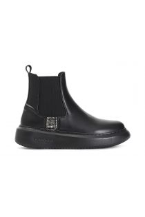 Bottine pour femme en cuir recouvert avec plateforme de 30 mm. chaussure au look sportif avec élastique sur le côté de la chaussure pour faciliter l'enfilage. insert latéral en strass. la semelle intérieure est en cuir assise plantaire interne. bout rond. hauteur semelle 40mm.
