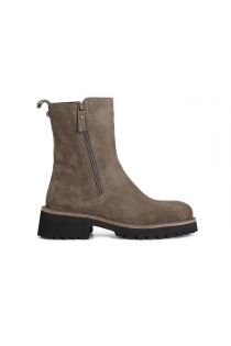 Bottine en daim avec double zip et clou personnalisé. talon haut de 50 mm. la semelle intérieure est en cuir.