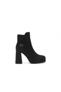 Bottine pour femme en microfibre avec accessoire spécial cafènoir. plateforme de 22 mm et talon haut de 100 mm. forme arrondie. zip interne à l'intérieur de la chaussure. la semelle intérieure est en cuir. tout cela donne un équilibre entre hauteur beauté et confort.