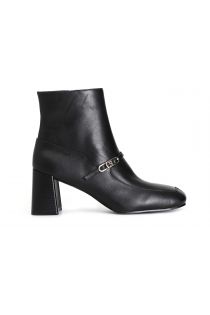 Bottine femme en nappa avec boucle personnalisée. fermeture éclair à l'intérieur. chaussure confortable au style innovant et raffiné ainsi que très féminine. la pointe et le talon de 65 mm sont carrés. la semelle intérieure est en cuir.