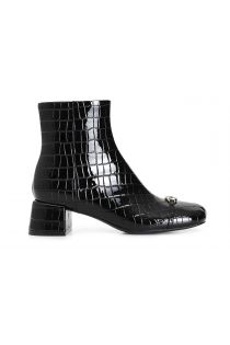 Bottine à bout arrondi effet crocodile avec accessoire personnalisé. fermeture éclair à l'intérieur de la chaussure. talon à bande de 45 mm de haut. la semelle intérieure est en cuir. idéal en combinaison avec plusieurs looks du matin au soir.