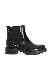 Bottines pour femme en similicuir brossé avec bande élastiques sur le côté de la jambe pour faciliter l’enfilage. le tout enrichi de micro-cabochons chromés. la semelle intérieure est en cuir.