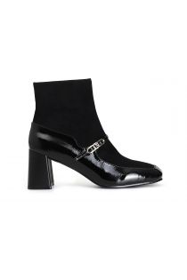 Bottine pour femme en naplak et daim avec boucle personnalisée. fermeture éclair à l'intérieur. chaussure confortable au style innovant et raffiné ainsi que très féminine. la pointe et le talon de 65 mm sont carrés. la semelle intérieure est en cuir.