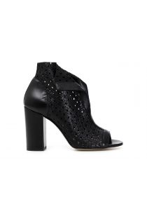 Bottines à bout ouvert en cuir perforé, le léger fil en métal inséré devant dans l’ourlet de l’empeigne permet de porter la bottine de deux manières, en rabattant les bords devant. Logo en métal visible ou fermé sur l’ouverture, selon la manière dont on les modèle.