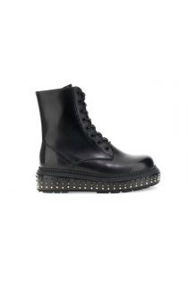 Bottines en similicuir brossé avec élastiques latéraux. Semelle intérieure en cuir et semelle compensée de 3,5 cm ornée de clous dorés et noirs. Confort et style affirmé.